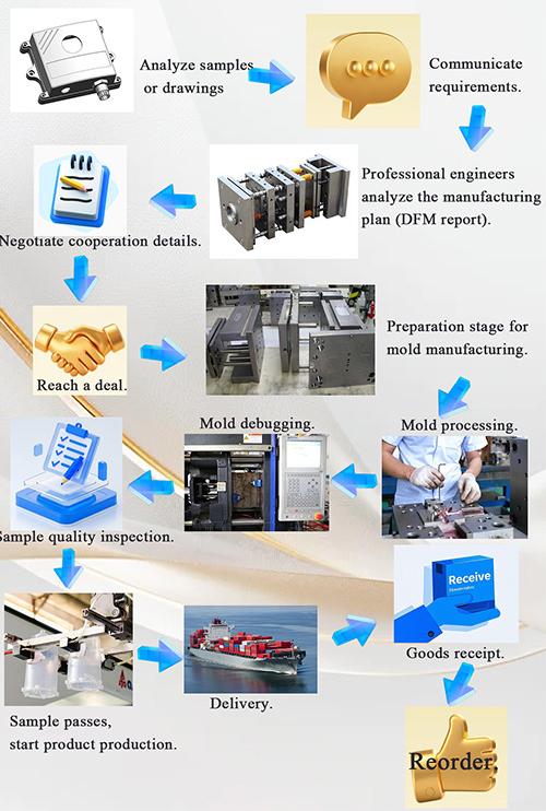 Desenhos de auditoria - análise de fluxo de molde - validação de projeto - Materiais personalizados - processamento de molde - processamento de núcleo - usinagem de eletrodo - Processamento do sistema de canal - processamento e aquisição de peças - aceitação de usinagem - processo de tratamento de superfície de cavidade - modo complexo Matriz - Todo o revestimento da superfície do molde - Placa de montagem - amostra de molde - teste de amostra - envio de amostras |